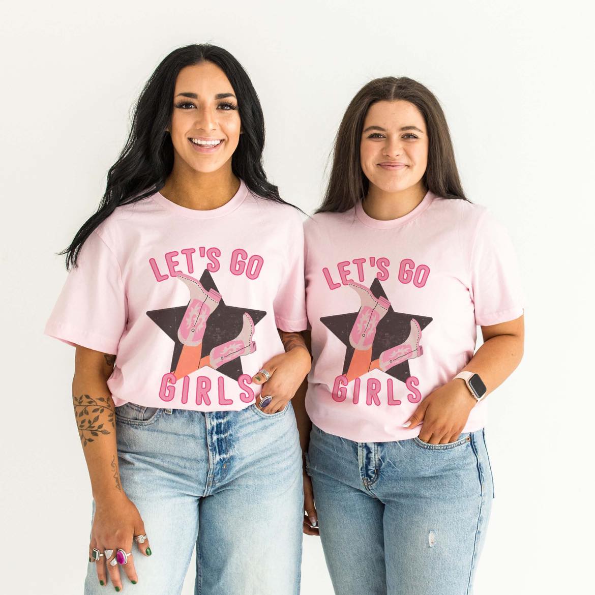 Let’s Go Girls T-Shirt (Pink): This playful pink tee features the empowering slogan “LET’S GO GIRLS,” adorned with a bold black star and whimsical lipstick graphics.