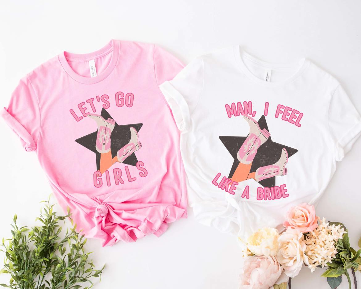 Man, I Feel Like a Bride T-Shirt (White): This crisp white tee states “MAN, I FEEL LIKE A BRIDE,” paired with matching star and lipstick imagery.