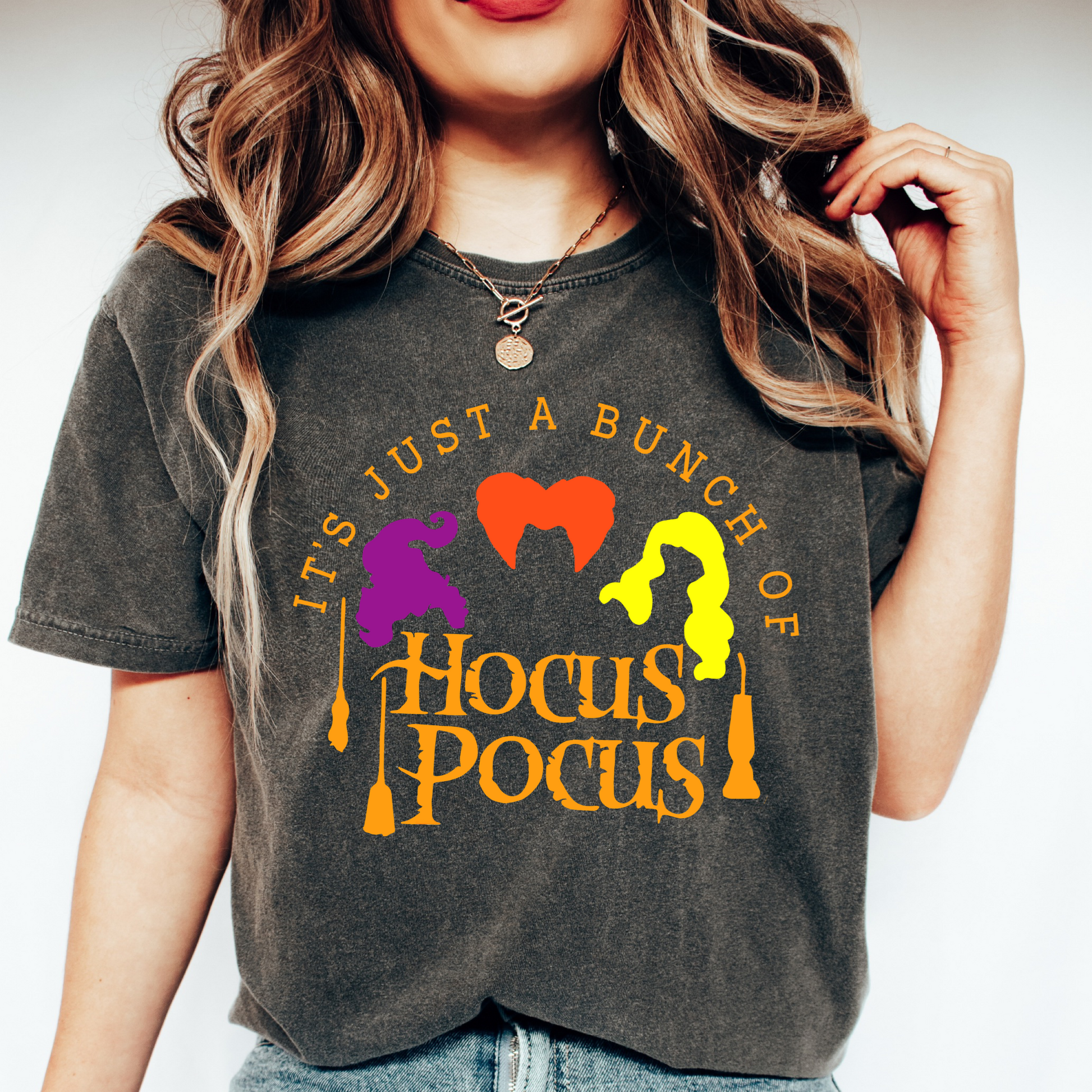 Experience the magic of this "It's Just a Bunch of Hocus Pocus" shirt, showcasing the infamous Salem witch sisters. Embrace your witchy side with this perfect addition to your wardrobe. See our other halloween shirts.