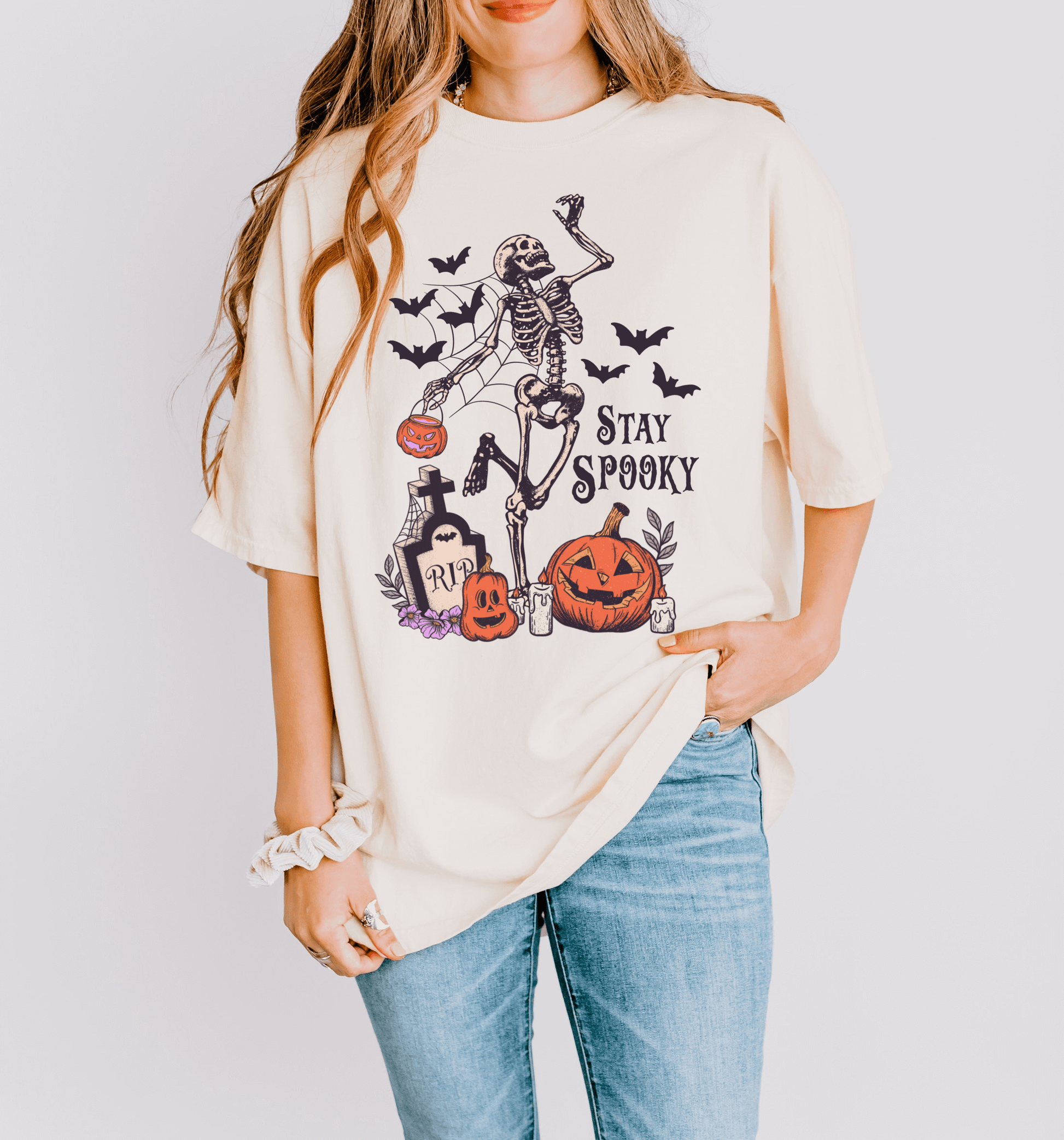 Get ready for Halloween with our Spooky Skeleton and pumpkins shirt. This shirt is perfect for women looking to add a touch of fun to their holiday wardrobe. See our other halloween shirts.