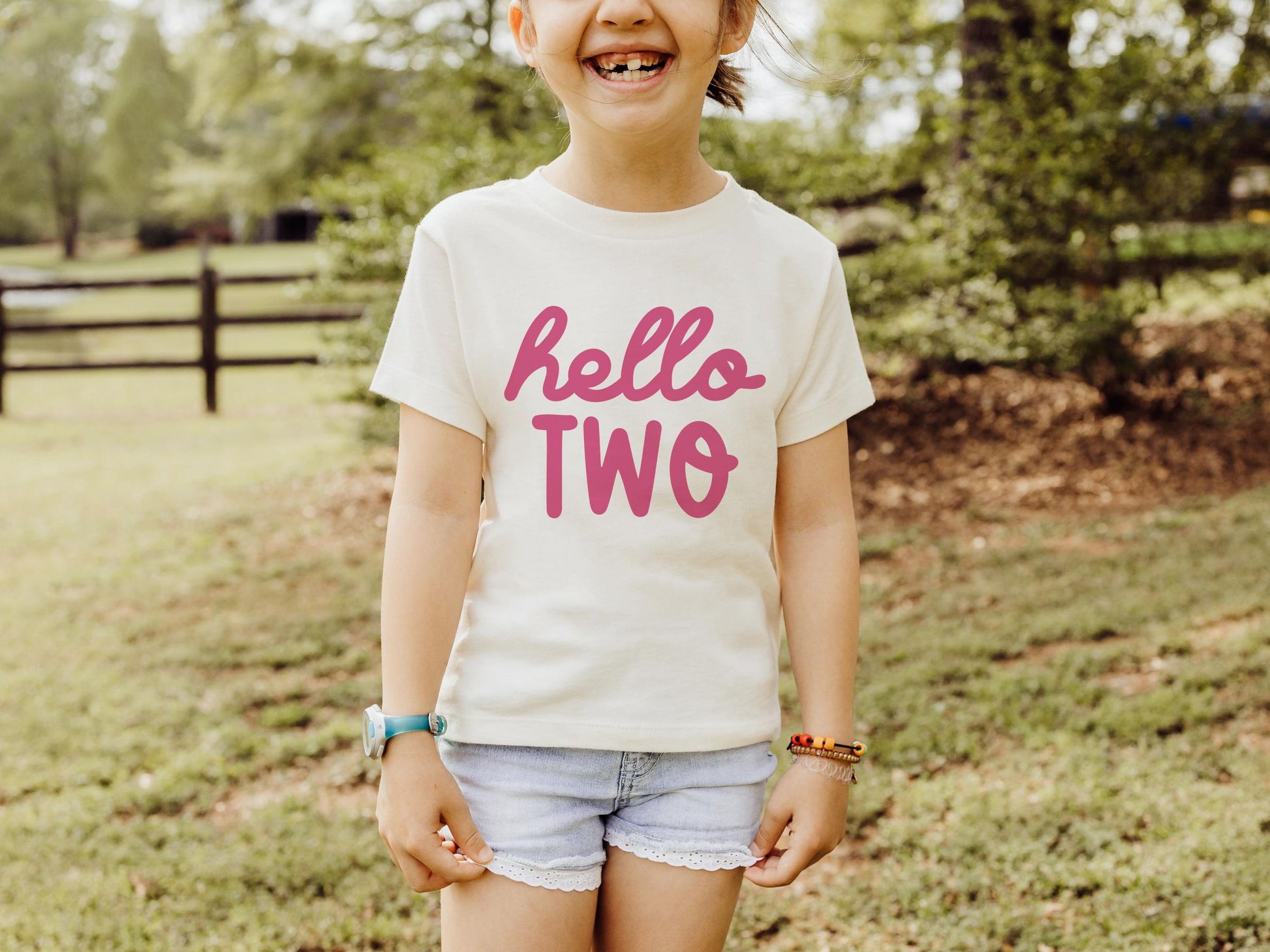 Celebrate your little one’s second birthday with our “Hello TWO” toddler t-shirt. This light cream tee is perfect for the big day and beyond. The front of the shirt features the phrase “Hello TWO” in a playful pink font, making it a trendy and adorable piece for your two-year-old. Whether it’s for a birthday party or a cute everyday look, this shirt is a charming choice.