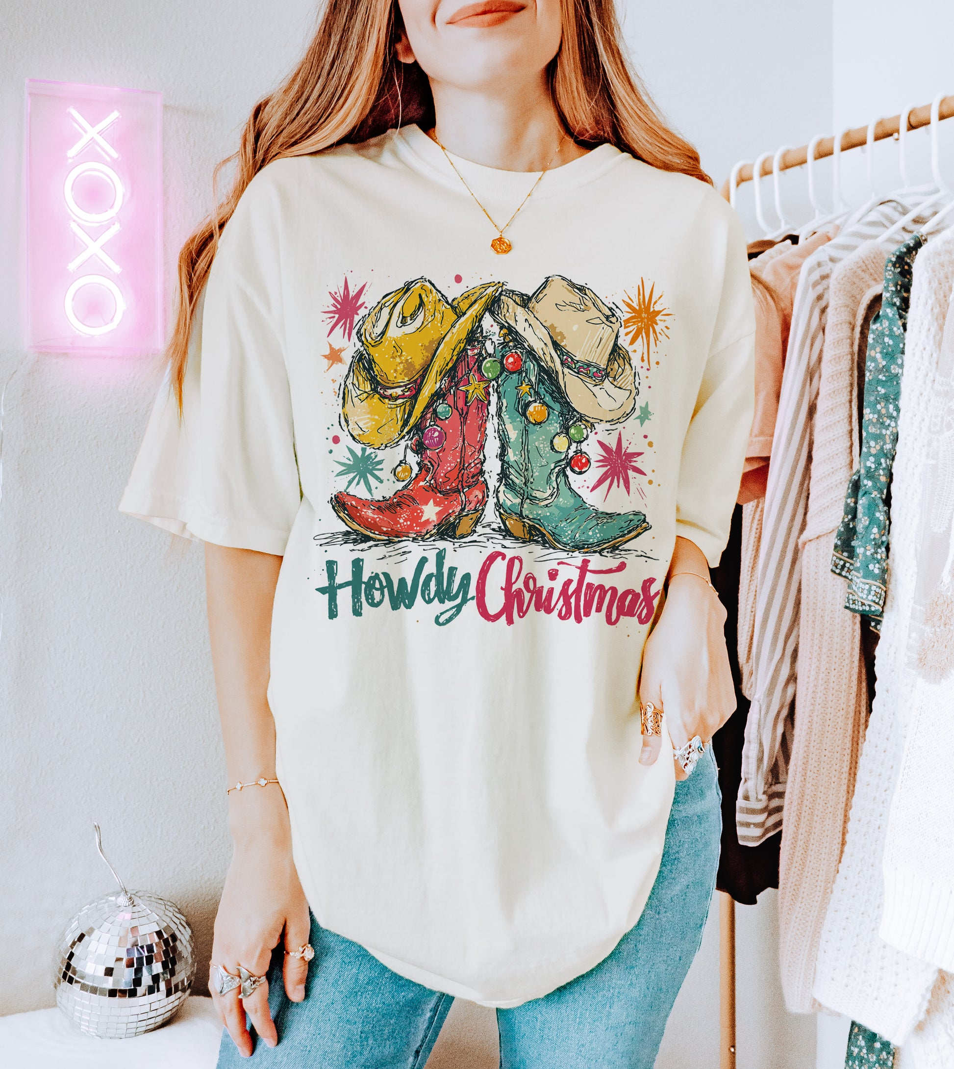 Introducing our Howdy Christmas t shirts in Comfort Colors. It has a western style Christmas theme with two western cowboy boots perfect for this merry season.