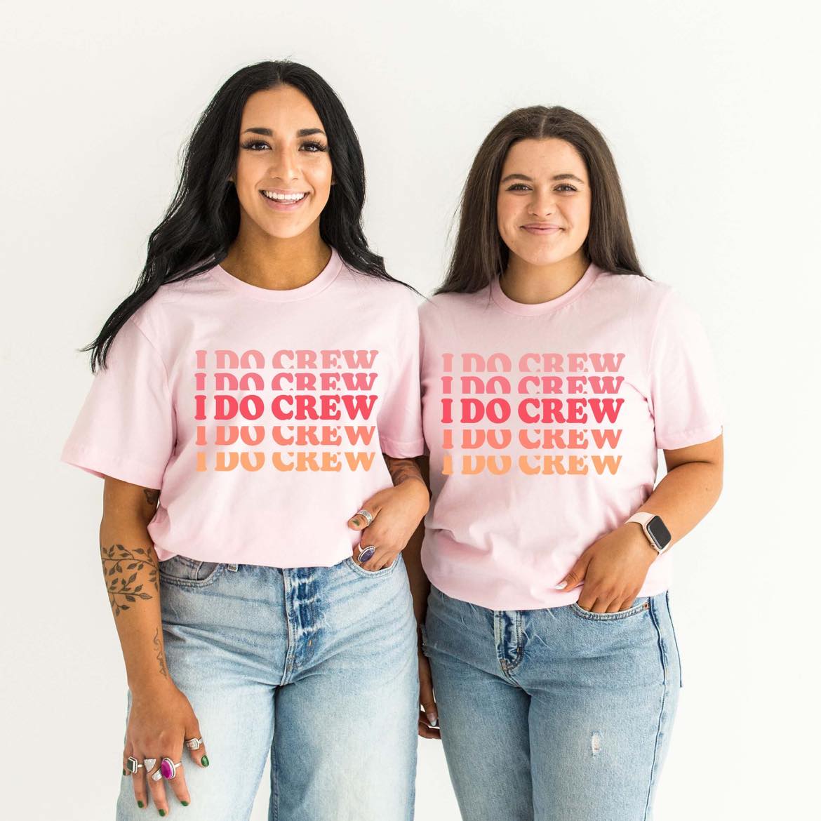 - Bold Lettering: Standout style with “I DO CREW” (pink) and “BRIDE” (white).