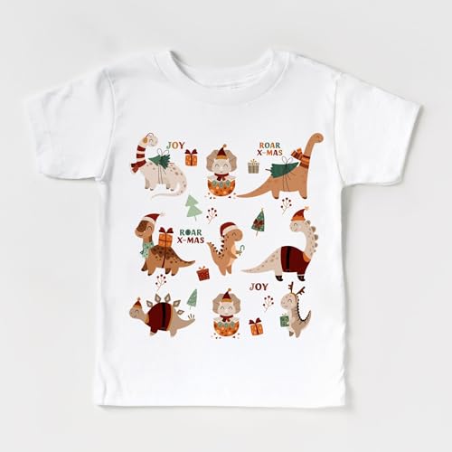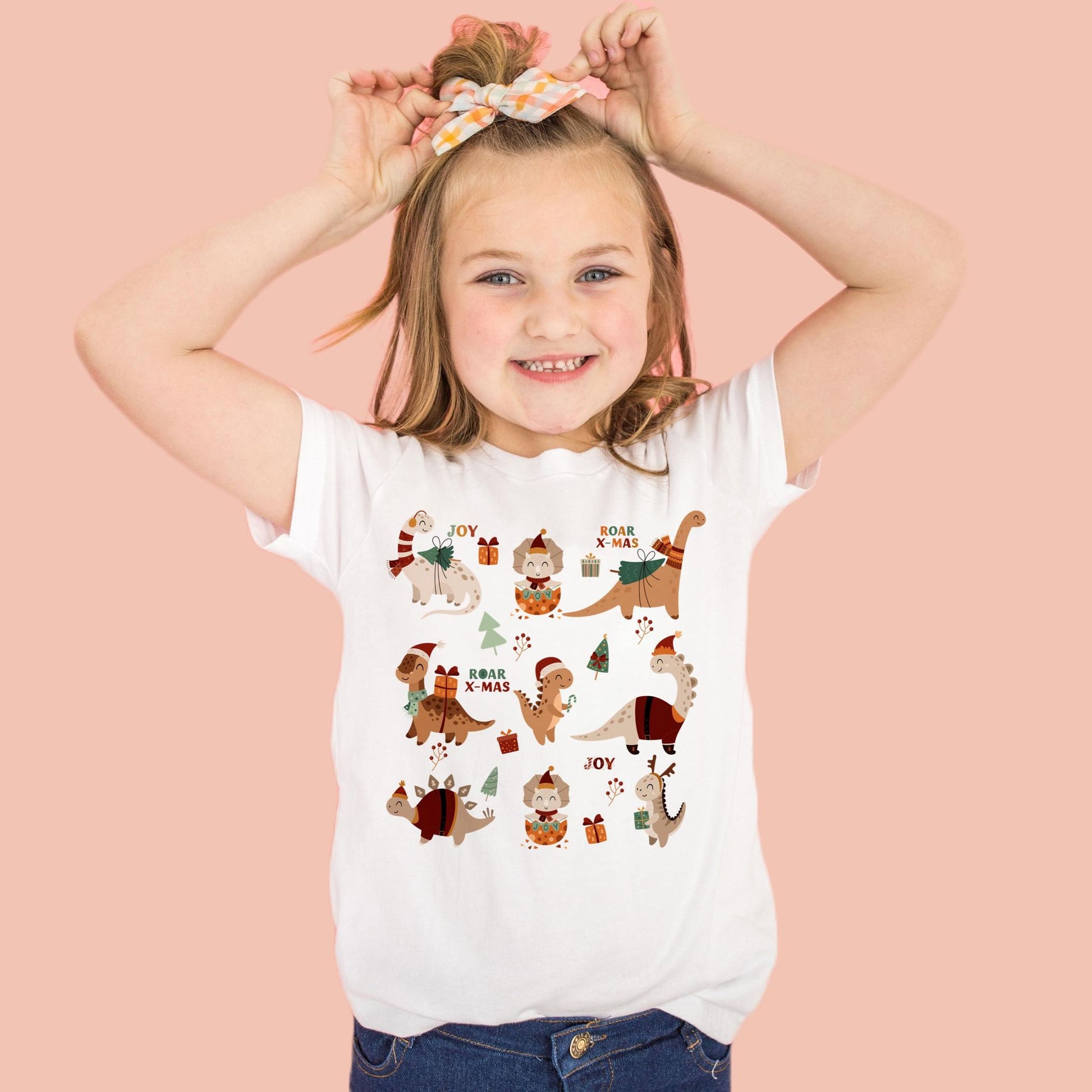 Celebrate the holiday season with our Kids Dinosaur Christmas T-Shirt. This playful tee features a variety of dinosaurs in Santa hats and scarves, with the words “Roar X-mas” and “Joy” scattered throughout. Made from soft and comfortable cotton, this shirt is perfect for your little one to wear during the festive season.