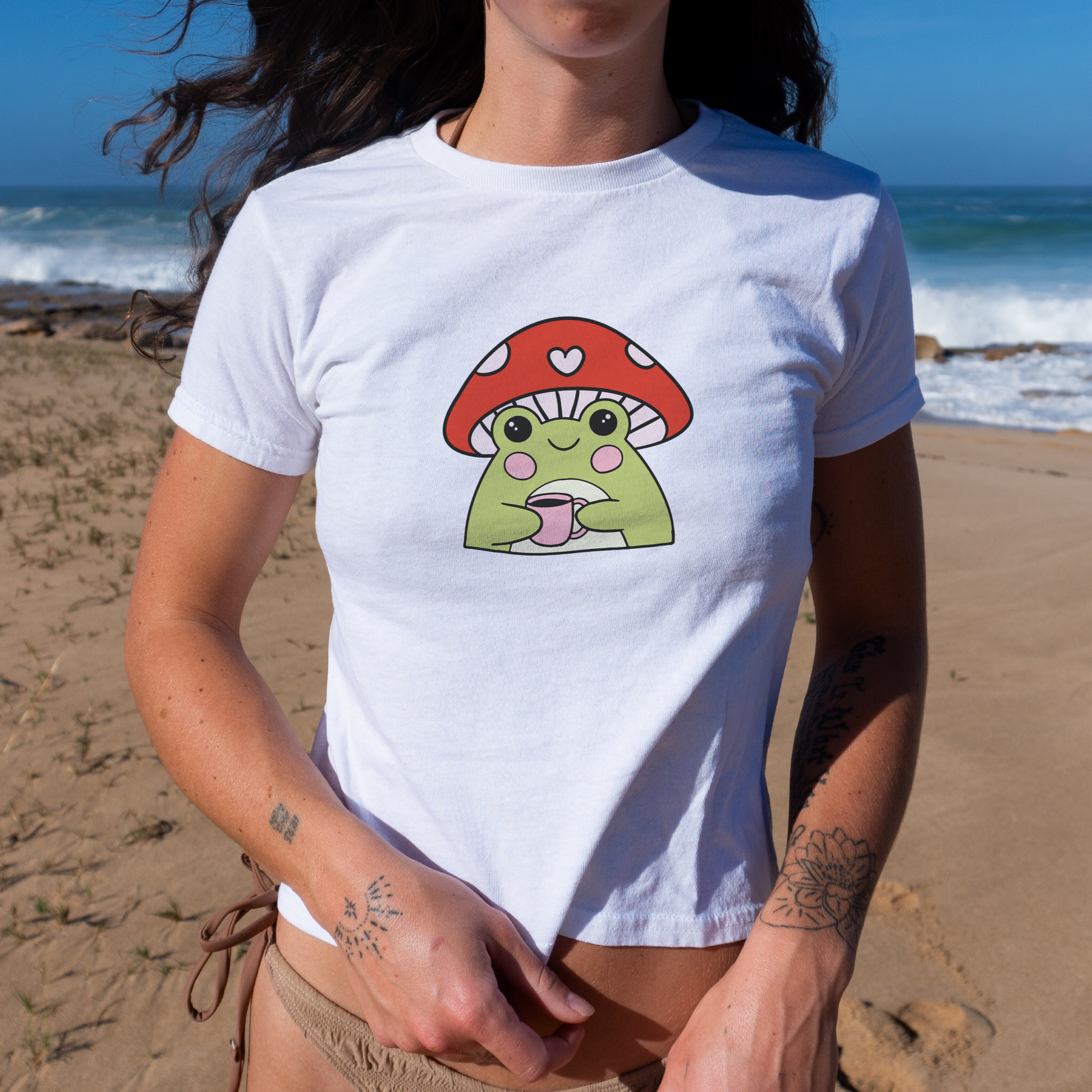 Introducing mushroom frog baby tee, a trendy piece with a y2k fashion vibe. Embrace the iconic style of the 2000s and stay on-trend with this baby tee. Perfect for adding a touch of nostalgia and edge to any outfit.