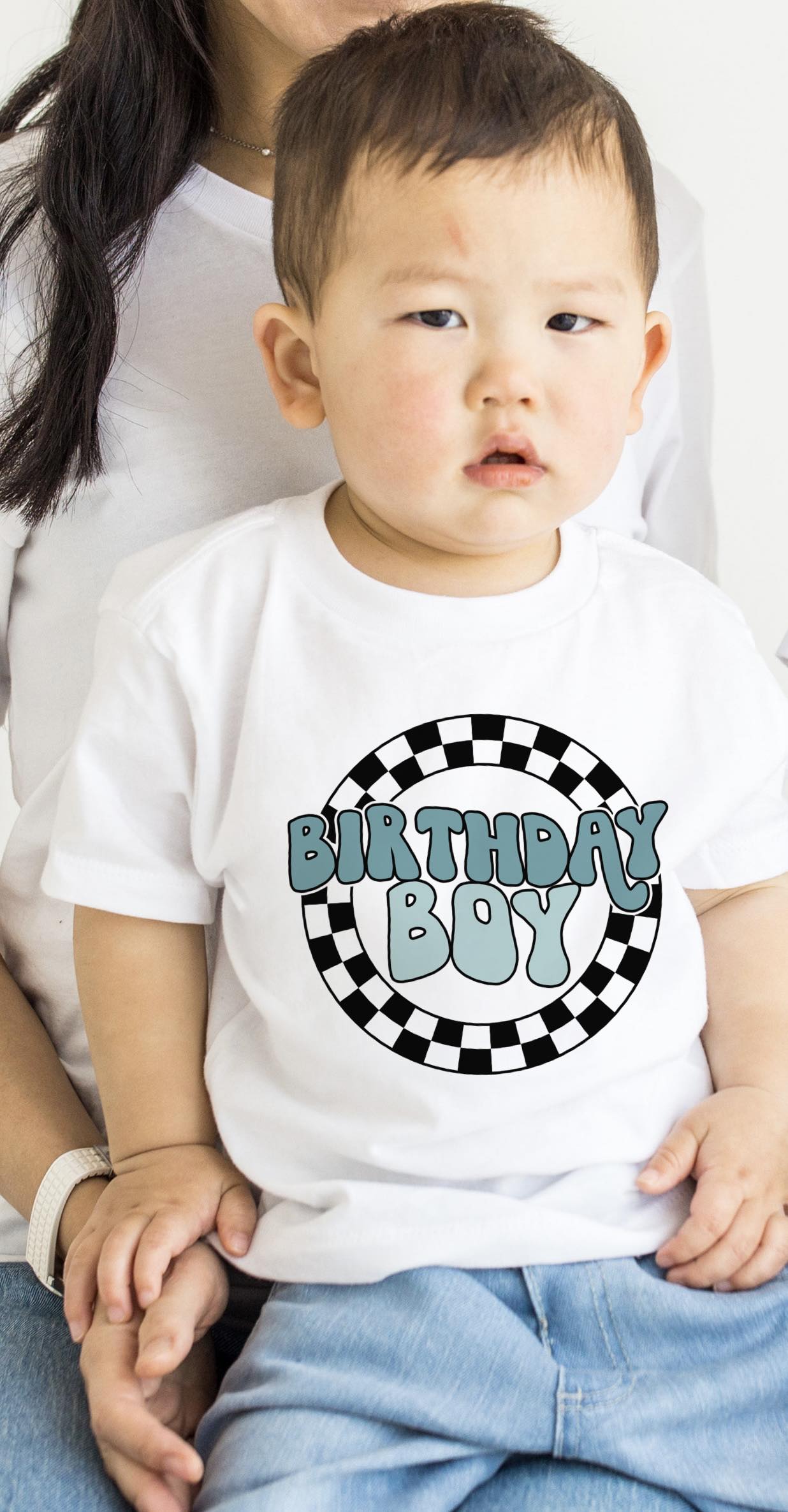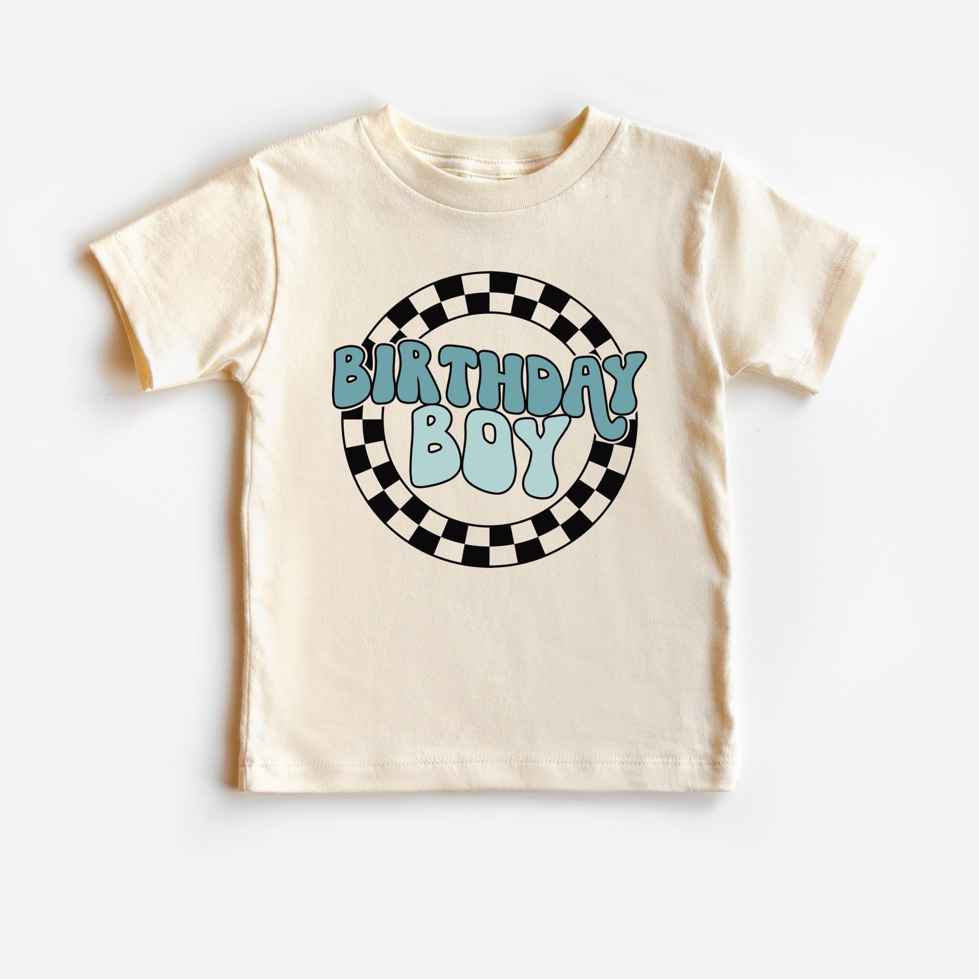 This is a charming white and natural color toddler t-shirt, perfect for a little and big boy’s birthday celebration. The shirt features a black and white checkered circle design with the words “Birthday Boy” written in a playful blue font. Made of soft, breathable cotton, this t-shirt ensures comfort while making your child stand out on his special day.