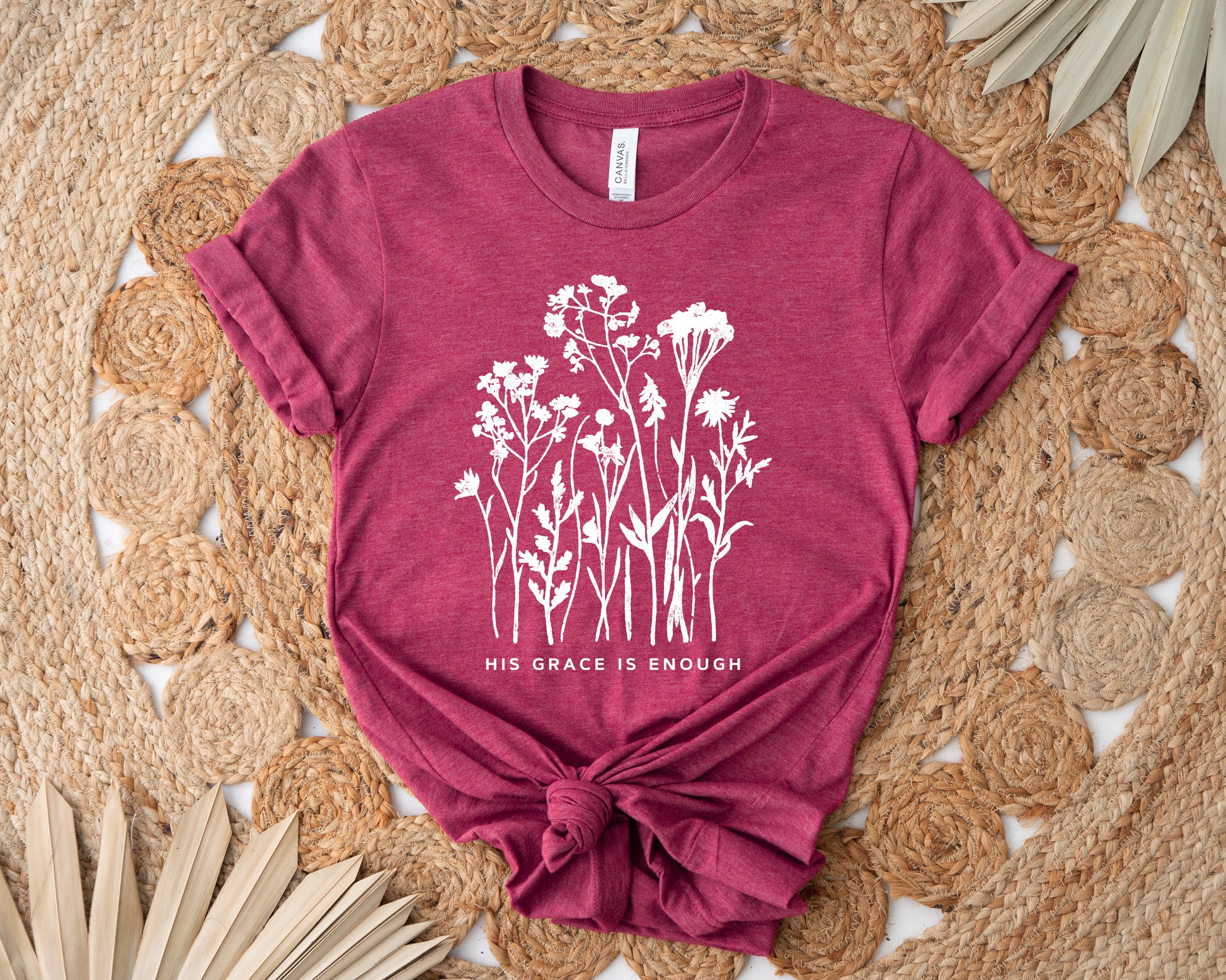 Wildflowers shirt with the message "His Grace is Enough". Made of 100 % cotton with a midweight feel, this tee suits those who prefer a comfy but stylish look. This shirt has a different texture than our Comfort Colors range. It is a regular fit shirt with four colors to choose from.